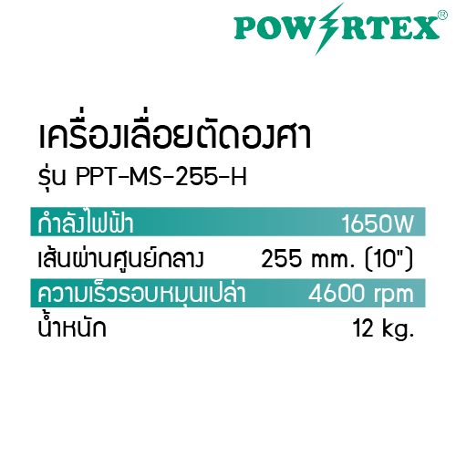 เครื่องเลื่อยตัดองศา POWERTEX รุ่น PPT-MS-255-H ถูกออกแบบมาสำหรับงานไม้ที่ต้องการความแม่นยำสูง เช่น งานเฟอร์นิเจอร์ งานโครงสร้างไม้ และงานติดตั้งต่าง ๆ ด้วยกำลังไฟฟ้าสูงถึง 1650W และใบเลื่อยขนาด 10 นิ้ว ทำให้ตัดได้เรียบ คม และรวดเร็ว