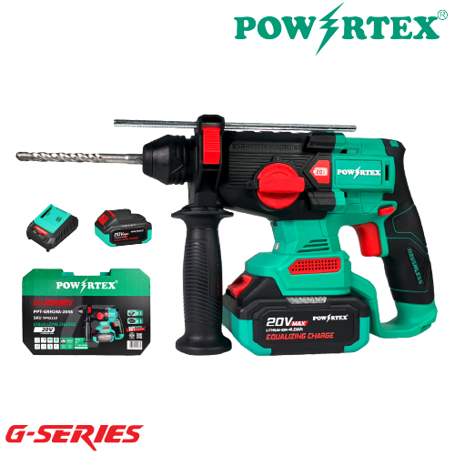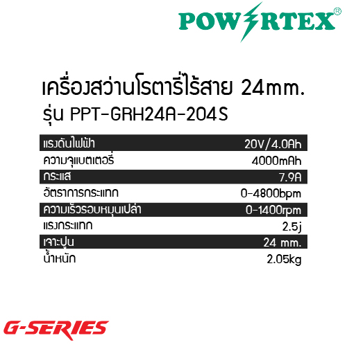 POWERTEX PPT-GRH24A-204S คือสว่านกระแทกไร้สายที่ออกแบบมาเพื่อรองรับงานเจาะปูน คอนกรีต และงานก่อสร้างที่ต้องการความทนทานสูง ด้วยระบบไร้สาย 20V ผสานแบตเตอรี่เก็บประจุขนาดใหญ่ 4.0Ah ให้พลังงานต่อเนื่องยาวนาน เหมาะสำหรับทำงานในพื้นที่ที่ไม่มีปลั๊กไฟหรือหน้างานที่ต้องการความคล่องตัวโดยเฉพาะ มอเตอร์ให้กระแสสูงถึง 7.9A และอัตราการกระแทก 0-4800 bpm ช่วยให้เจาะปูนขนาด 24 มม. ได้อย่างรวดเร็ว แม่นยำ และลดแรงของผู้ใช้งาน น้ำหนักเพียง 2.05 กก. ทำให้ควบคุมง่าย ไม่เมื่อยมือ เหมาะสำหรับงานติดตั้ง งานซ่อมบำรุง และงานช่างระดับมืออาชีพที่ต้องการความคล่องตัวมากกว่าแบบมีสาย