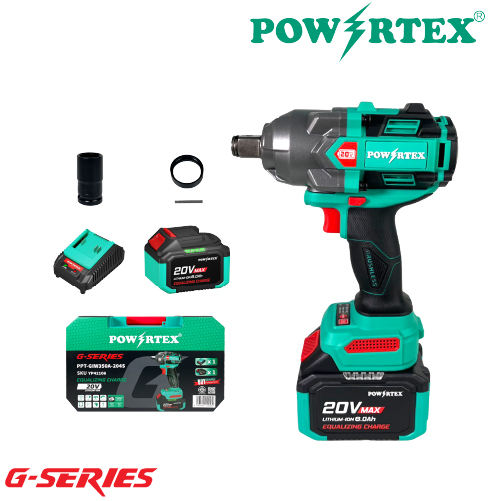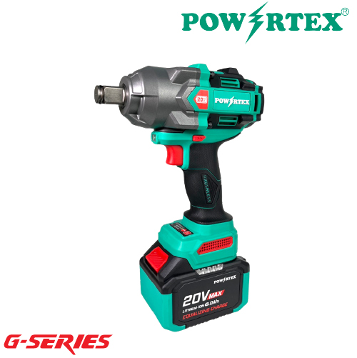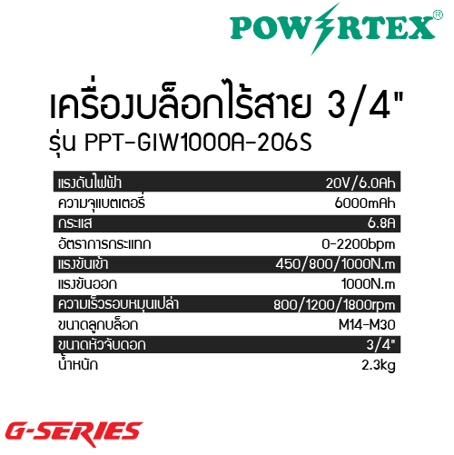 POWERTEX G-Series PPT-GIW1000A-206S เครื่องบล็อกกระแทกไร้สาย 20V 3/4 นิ้ว สำหรับงานขันน็อตหนัก ออกแบบมาสำหรับงานอุตสาหกรรมและช่างมืออาชีพ ด้วยระบบไร้สาย 20V แบตเตอรี่ 6.0Ah ให้แรงบิดสูงสุดถึง 1000 N.m พร้อมความเร็วรอบ 800/1200/1800 rpm ทำงานได้รวดเร็ว แม่นยำ