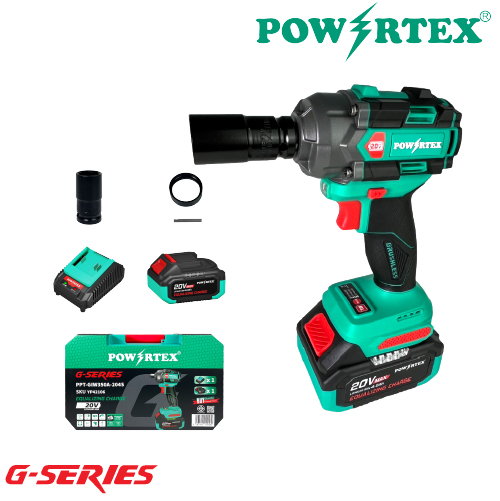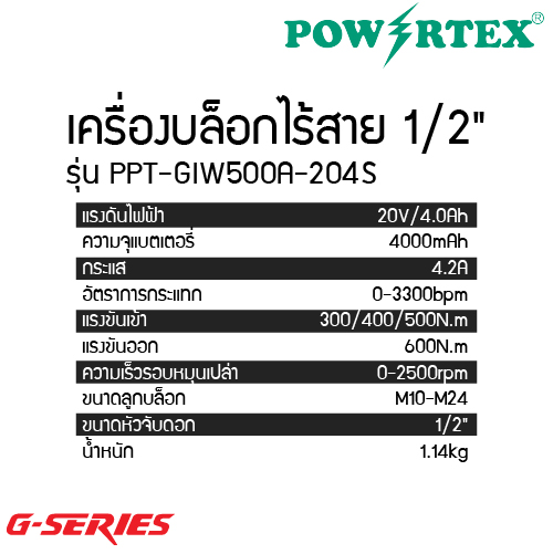 POWERTEX G-Series PPT-GIW500A-204S เครื่องบล็อกกระแทกไร้สาย 20V 1/2 นิ้ว สำหรับงานขันน็อตระดับมืออาชีพ ออกแบบมาเพื่อการขันน็อตและงานประกอบอย่างมืออาชีพ ด้วยระบบไร้สาย 20V แบตเตอรี่ 4.0Ah ให้แรงบิดสูงสุดถึง 600 N.m พร้อมความเร็วรอบ 0-2500 rpm ทำงานได้รวดเร็ว แม่นยำ