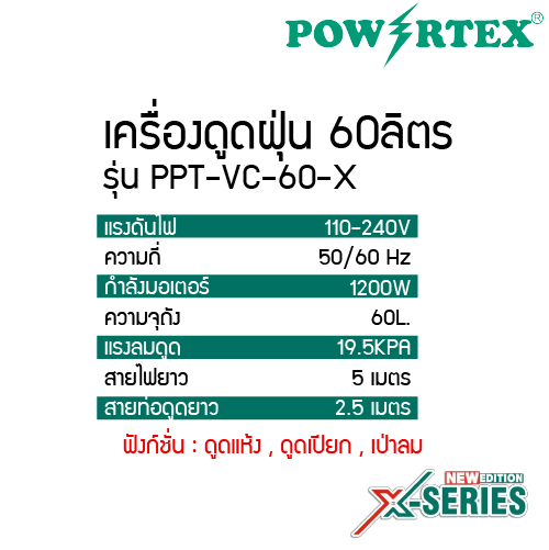 POWERTEX | เครื่องดูดฝุ่น60ลิตร รุ่น PPT-VC-60-X NEW!