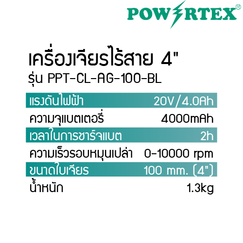 เครื่องเจียรไร้สาย อุปกรณ์เครื่องมือช่างคุณภาพจาก POWERTEX เหมาะสำหรับงานเจียร ตัด ขัด ทั้งเหล็ก ไม้ และวัสดุทั่วไป มาพร้อมแบตเตอรี่ลิเธียมไอออนชาร์จเร็ว ขนาดกะทัดรัด น้ำหนักเบา ดีไซน์ตามหลักสรีรศาสตร์ จับถนัดมือ ปลอดภัยในการใช้งาน สะดวกทุกพื้นที่