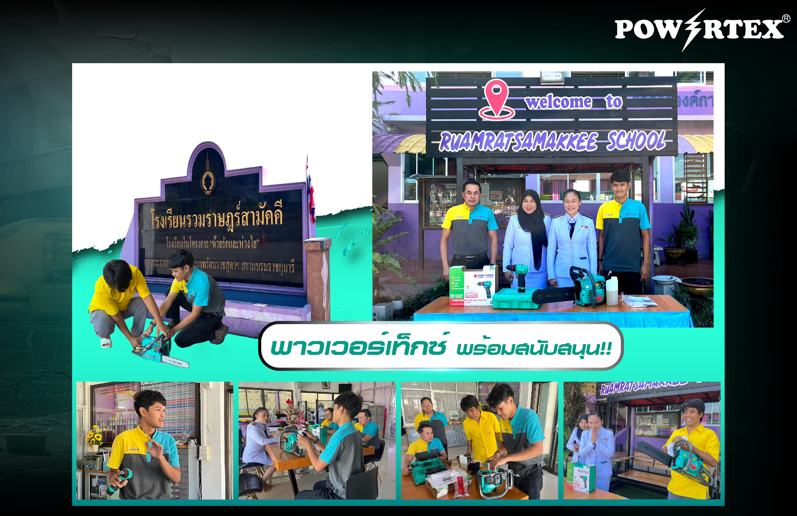บริษัท พาวเวอร์เท็กซ์ เวิลด์ไวด์ จำกัด ได้มอบเลื่อยโซ่ยนต์ รุ่น GCS-38 และสว่านไร้สายถอดหัวได้ รุ่น PPT-CL-CD-10-HQ-BL ให้กับ โรงเรียนรวมราษฎร์สามัคคี ตำบลบึงคอไห อำเภอลำลูกกา จังหวัดปทุมธานี เพื่อช่วยสนับสนุนการปรับปรุงและซ่อมแซมภายในโรงเรียน