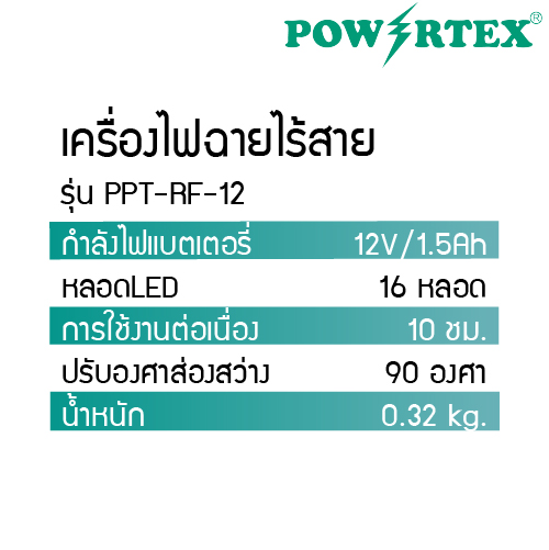 POWERTEX | ไฟฉายไร้สาย 12V/1.5Ah รุ่นPPT-RF-12