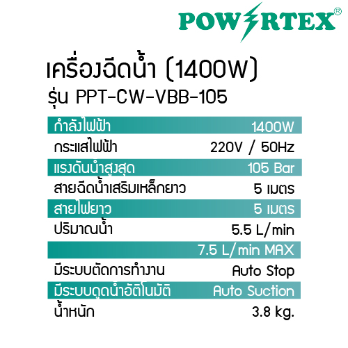 เครื่องฉีดน้ำแรงดันสูง POWERTEX รุ่น PPT-CW-VBB-105 ออกแบบมาเพื่อตอบโจทย์การทำความสะอาดทั้งภายในบ้านและงานกลางแจ้ง ด้วยแรงดันน้ำสูงถึง 105 บาร์ จึงสามารถชำระล้างสิ่งสกปรก คราบฝังแน่น และฝุ่นดินได้อย่างง่ายดาย ไม่ว่าจะเป็นการล้างรถ มอเตอร์ไซค์ พื้นบ้าน กำแพง หรือเครื่องมือช่าง ตัวเครื่องมีขนาดกะทัดรัด น้ำหนักเบา เคลื่อนย้ายสะดวก และใช้งานได้ง่ายแม้ผู้ที่ไม่เคยใช้เครื่องฉีดน้ำมาก่อน