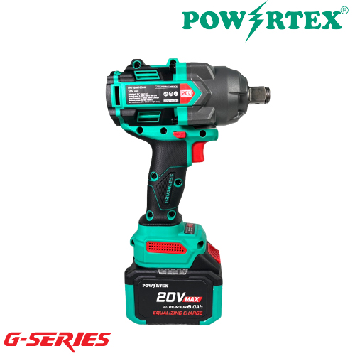POWERTEX G-Series PPT-GIW1000A-206S เครื่องบล็อกกระแทกไร้สาย 20V 3/4 นิ้ว สำหรับงานขันน็อตหนัก ออกแบบมาสำหรับงานอุตสาหกรรมและช่างมืออาชีพ ด้วยระบบไร้สาย 20V แบตเตอรี่ 6.0Ah ให้แรงบิดสูงสุดถึง 1000 N.m พร้อมความเร็วรอบ 800/1200/1800 rpm ทำงานได้รวดเร็ว แม่นยำ