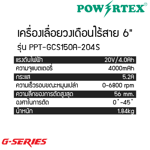 POWERTEX G-Series PPT-GCS150A-204S เครื่องเลื่อยวงเดือนไร้สาย 20V สำหรับงานไม้และงานซ่อมแซม