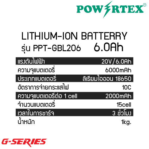 POWERTEX | LITHIUM-ION BATTERRY 20V 6.0Ah รุ่น PPT-GBL206