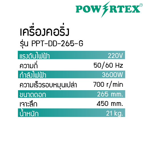 เครื่องคอริ่ง POWERTEX รุ่น PPT-DD-265-G ออกแบบสำหรับงานเจาะคอนกรีตอย่างมืออาชีพ ด้วยกำลังไฟฟ้า 3600W และความเร็วรอบหมุน 700 rpm ทำให้การเจาะคอนกรีตหนาและแน่นมีประสิทธิภาพสูง