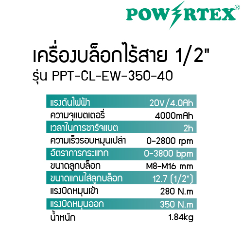 POWERTEX | บล็อกไร้สาย 1/2นิ้ว รุ่น PPT-CL-EW-350-40