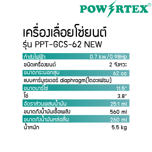 POWERTEX | เลื่อยโซ่ยนต์ 2 จังหวะ รุ่น PPT-GCS-62 NEW
