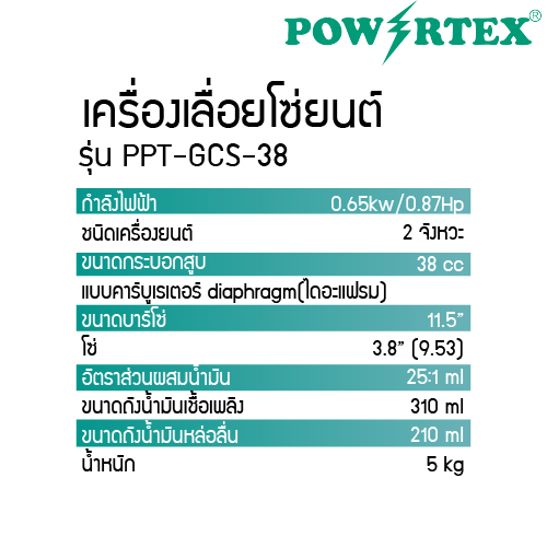 POWERTEX | เครื่องเลื่อยโซ่ยนต์ 0.65KW/0.87HP รุ่นPPT-GCS-38