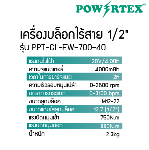 POWERTEX | บล็อคไร้สาย รุ่นPPT-CL-EW-700-40